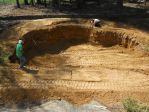 There will be a large retaining wall from natural stone in the back with a water feature and a smaller retaining wall in the front that we can set drinks on. The shallow end and steps are on the right with two benches, one in the shallow end and the other in the deep end. Since the back wall is substantially higher than the water line, there is a grip ledge running along the entire side.